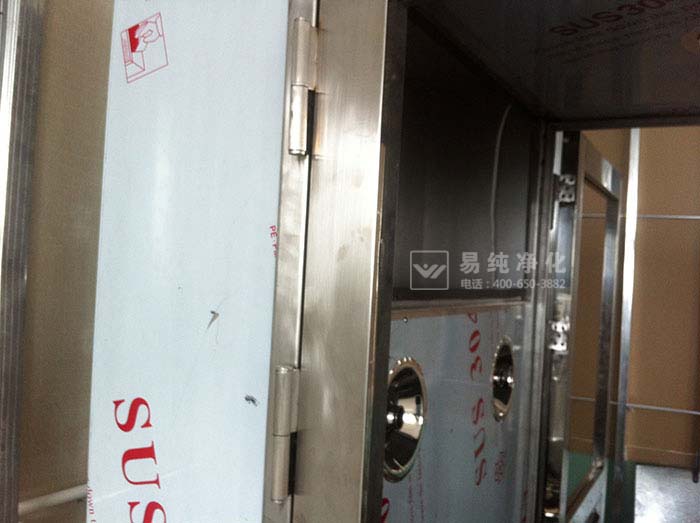 (四)整體框架完成之后,再進行門安裝,門和門框皆由不銹鋼方管及不銹鋼制作,鉸鏈采用三道不銹鋼鉸鏈加固,原門框與門板已經(jīng)由廠家出廠前已經(jīng)安裝好。此時只需要將鉸鏈固定于風淋側(cè)面廂體之可。如果門安裝好之后門框與箱體之間縫隙不齊平有摩擦,那么是因為地平不平而導致,此步驟并不需要調(diào)整門框,只需要對風淋下部進行垂直校正,將風淋底盤墊平即可??煞磸驼{(diào)試四角加墊片,一旦墊平,門體將會與箱體縫隙完全整齊。